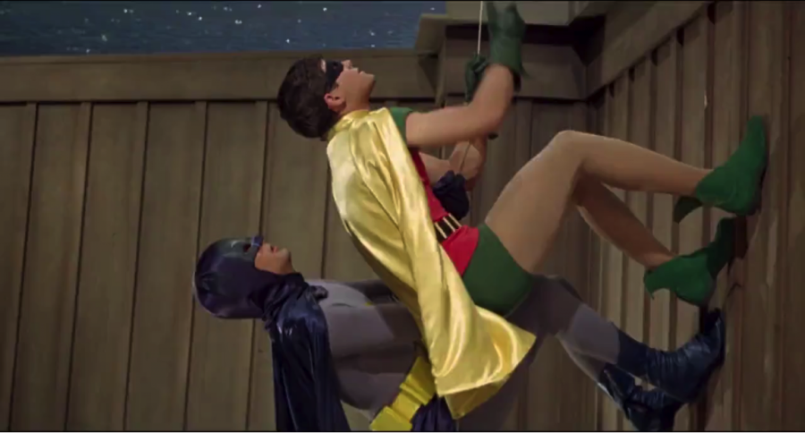 Batman and Robin climb up a wall with their batarang in the movie “Batman” (1966) (PG)