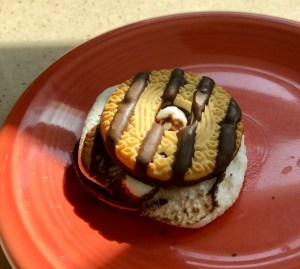Using a shish kabob skewer inserted into marshmallow, dip into chocolate, coating it completely. Allow excess chocolate to drip off, and then place coated marshmallow over the center of the cookie. (If using Ho Ho’s, just adhere cut side onto cookie with melted chocolate.)