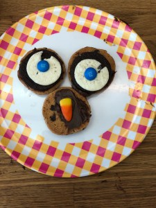 Place one m&m/eye in the center of the cream of each Oreo.